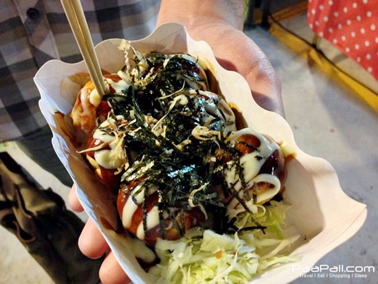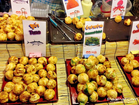 ทาโกะยากิ ที่ทำกันสดๆ หน้าร้าน หอม สด อร่อย และมีหลากหลายรสไม่ว่าจะเป็นทูน่า, ยำสาหร่าย, ปลาหมึก