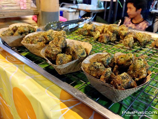 พลาดไม่ได้กลับไข่ปลาหมึกทอด เพราะมันเป็นคือ Signature ของตลาดนัดรถไฟ แต่บอกไว้ตรงนี้ว่าราคาไม่ธรรมดา ขนาดเล็กสุดเริ่มต้นที่ 50 บาท ราคานี้มีเงิบ!!